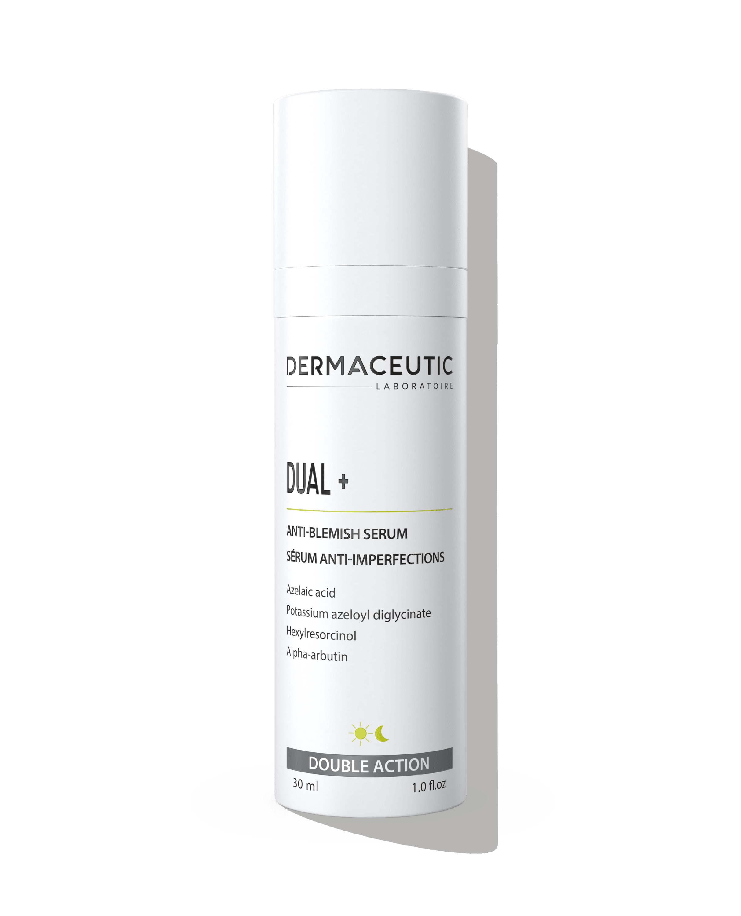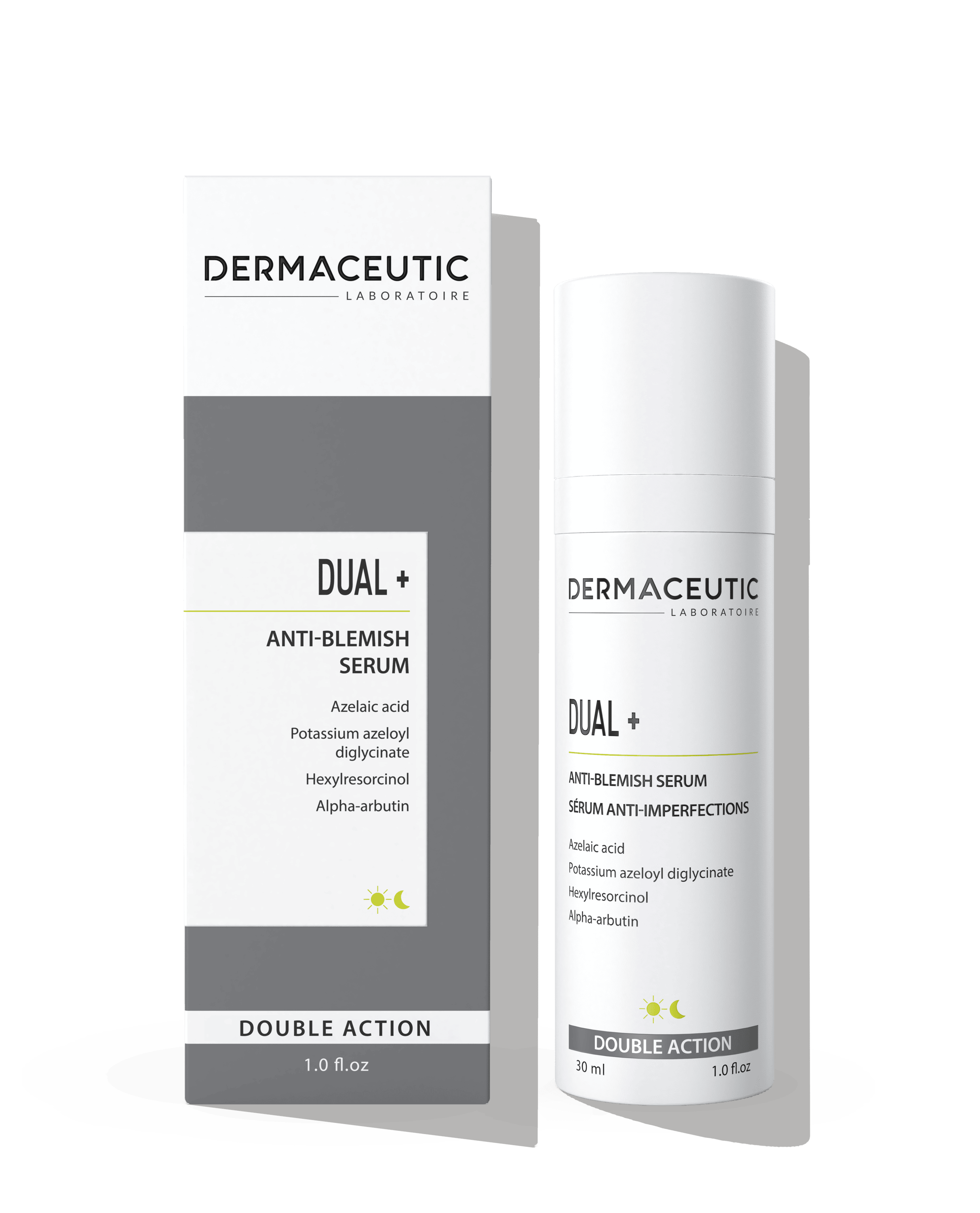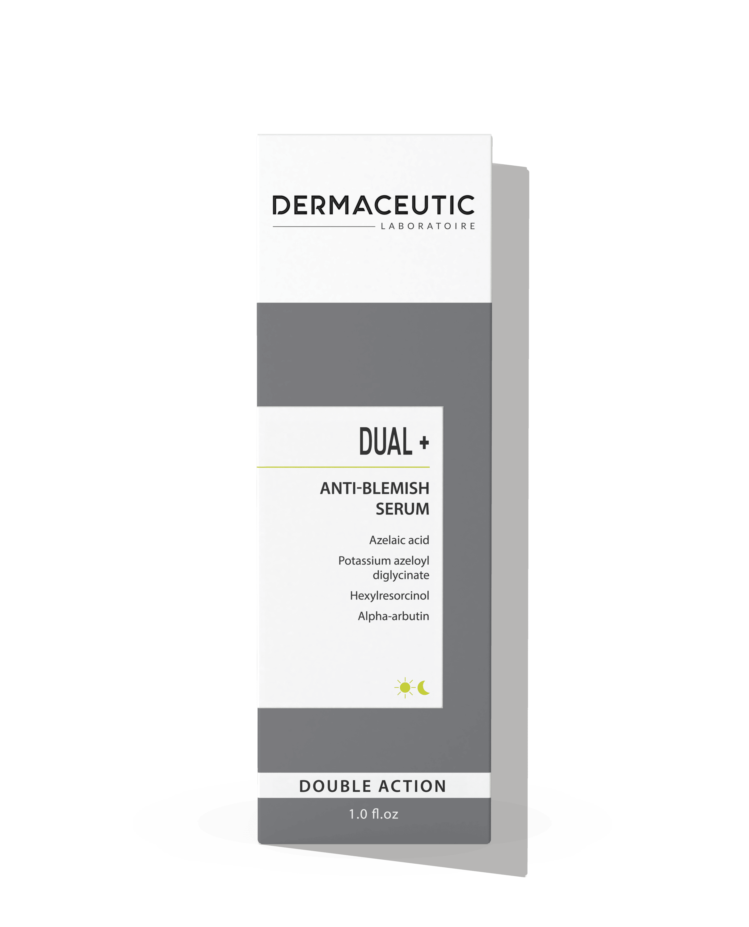 Dual + is formulated with a unique combination of two forms of azelaic acid and lightening actives to offer a double action against pigment spots and emerging breakouts. Comedolytic and non-comedogenic effect. Prescribed to target the appearance of pigments spots and acne-prone skin induced imperfections
